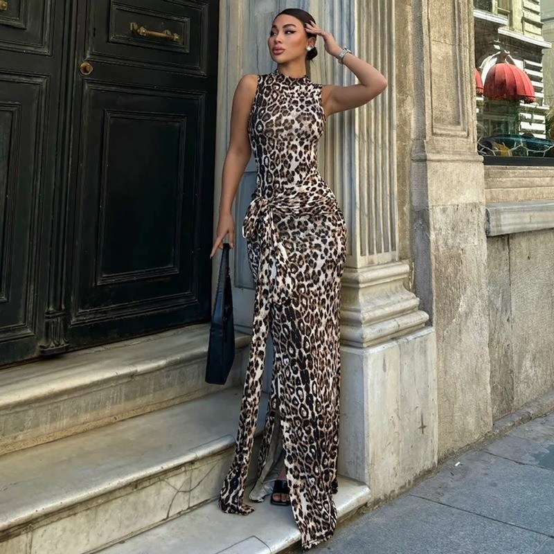 Yeni Moda Özel Baskı Zayıf Bel Bağı Çatlak Kolsuz Elbise